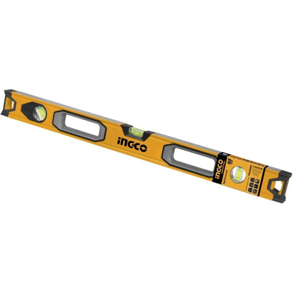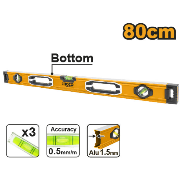 Алюминиевый фрезерованный уровень 800 мм INGCO HSL08080 INDUSTRIAL оснащен 3 глазками, удобный в применении измерительный инструмент для проверки правильности вертикали или горизонтали.