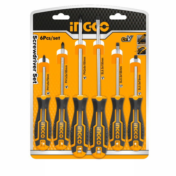 Набор отвëрток 6 шт Cr-V SUPER INGCO HKSD0628 имеет в комплекте три отвертки с прямым шлицем и три отвертки с крестовым.
