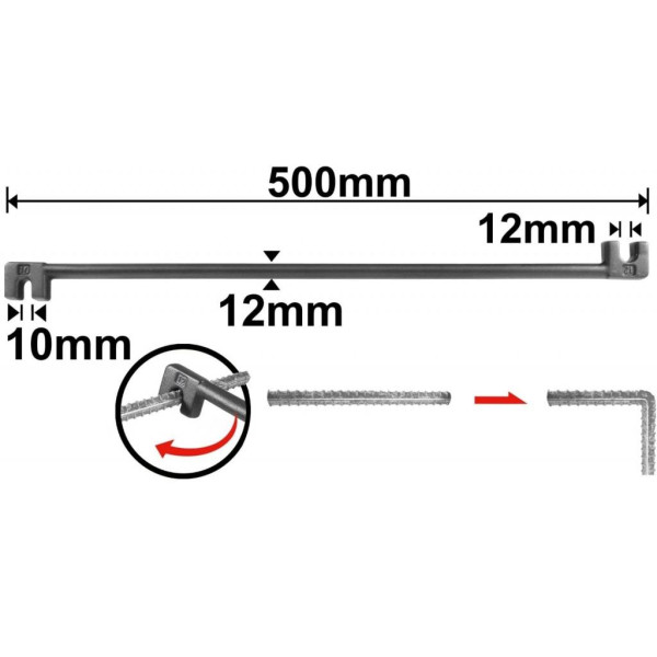 Струбцина для гибки арматуры 500 мм INGCO HBB10121 применяется для холодной гибки стальной арматуры круглого, крадратного и плоского профиля. Материал струбцины углеродистая сталь #45. Длина и толщина инструмента 500х12 мм. Диаметр 10 и 12 мм.