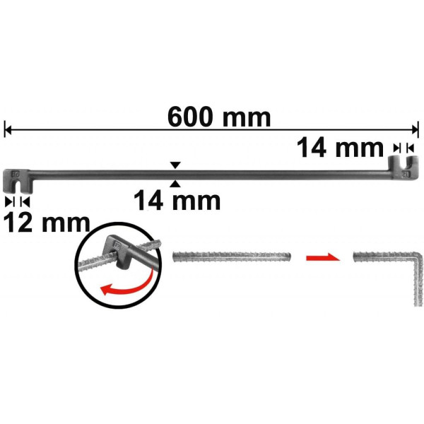 Струбцина для гибки арматуры 600 мм INGCO HBB12141 применяется для холодной гибки стальной арматуры круглого, крадратного и плоского профиля. Материал струбцины углеродистая сталь #45. Длина и толщина инструмента 600х14 мм. Диаметр 12 и 14 мм.