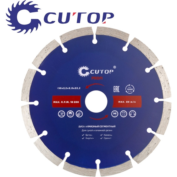Диск алмазный сегментированный торговой марки CUTOP обладает посадочным отверстием 22,2 мм с наружным диаметром 150 мм подходит для углошлифовальных машин различных марок.