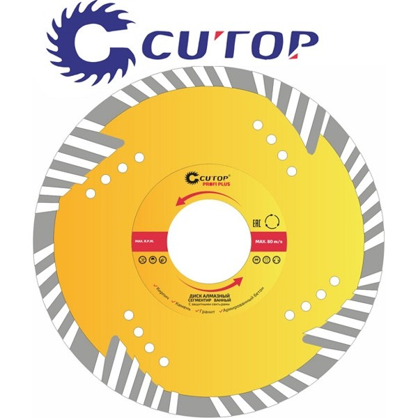 Диск Cutop Profi Plus 67-416 предназначен для резки армированного бетона, керамической плитки, гранита, кирпича, камня. Защитные сектора диска обеспечивают защиту режущего слоя от бокового износа.