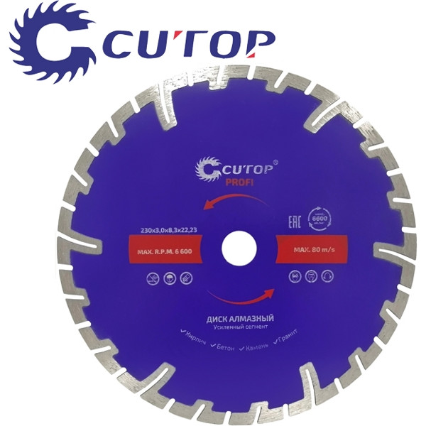 Диск Cutop Profi 66-23030 для резки камня, гранита, бетона, кирпича. Сухая и влажная резка. В качестве абразива используются качественные синтетические алмазы. Изготовлен из инструментальной стали. Предназначен для профессионального использования.